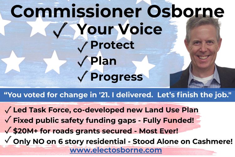 Continue voting NO on apartments not in our Land Use Plan. Since being elected in '21 fewer than 250 have reached the Board. I was the lone "no" vote against the 6-story Cashmere project, defending the citizen-created Land Use Plan.